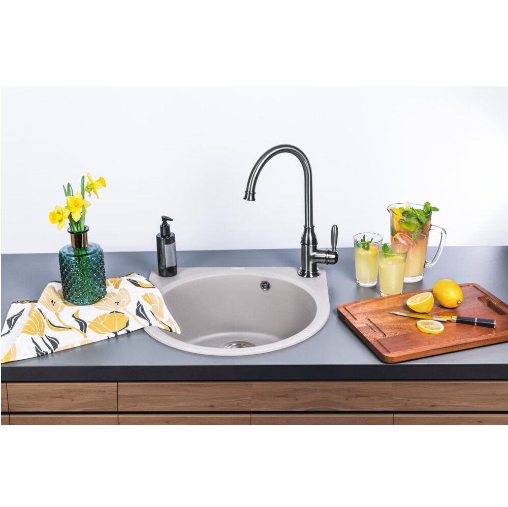 Мойка кухонная Omoikiri из коллекции Akegata 51-GR имеет размеры 510х510 мм., изготовлена из искусственного гранита. Форма — округлая, одна чаша без отверстия для смесителя. Сифон в комплекте. Ширина чаши 46. Врезной монтаж.