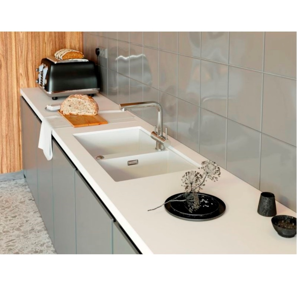 Мойка кухонная Omoikiri из коллекции Kitagawa 83-2-U-WH имеет размеры 836х488 мм., изготовлена из искусственной керамики. Форма — прямоугольная, две чаши без отверстия для смесителя. Сифон в комплекте. Ширина чаши 36,5. Врезной монтаж.