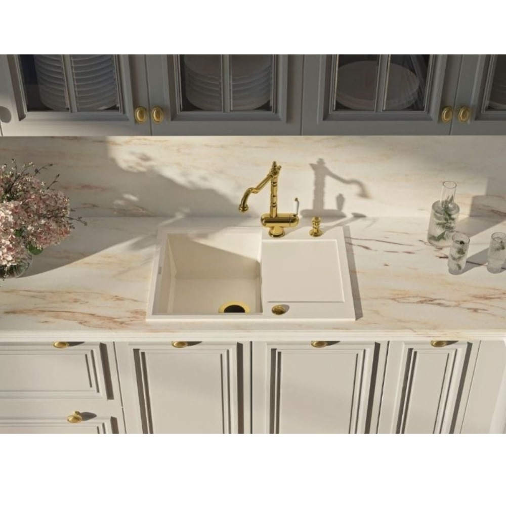 Мойка кухонная Omoikiri из коллекции Sakaime 68-WH имеет размеры 680х500 мм., изготовлена из искусственного гранита. Форма — прямоугольная, одна чаша без отверстия для смесителя. Сифон в комплекте. Ширина чаши 33,8. Врезной монтаж.