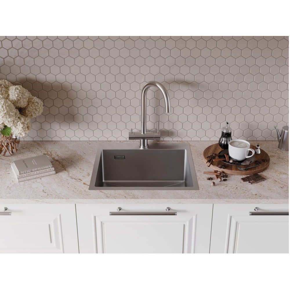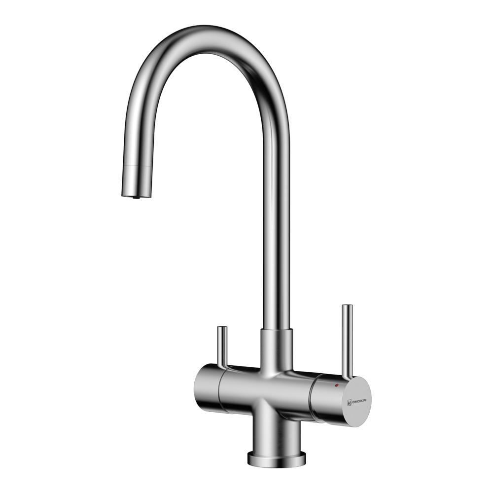Смеситель для кухни Omoikiri Akita с подключением фильтра оснащен рычажным управлением для регулировки температуры и напора воды. Горизонтальный монтаж на 1 отверстие. Поворотный излив 195 мм.