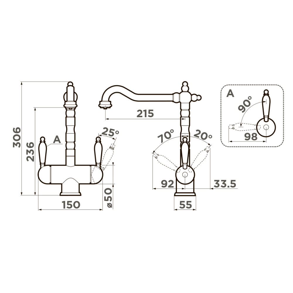 Смеситель для кухни Omoikiri Amagasaki с подключением фильтра оснащен рычажным управлением для регулировки температуры и напора воды. Горизонтальный монтаж на 1 отверстие. Поворотный излив 215 мм.