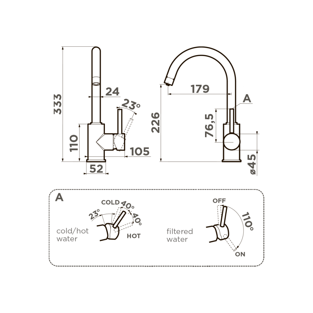 Смеситель для кухни Omoikiri Shinagawa 2 Plus с подключением фильтра оснащен рычажным управлением для регулировки температуры и напора воды. Горизонтальный монтаж на 1 отверстие. Поворотный излив 179 мм.