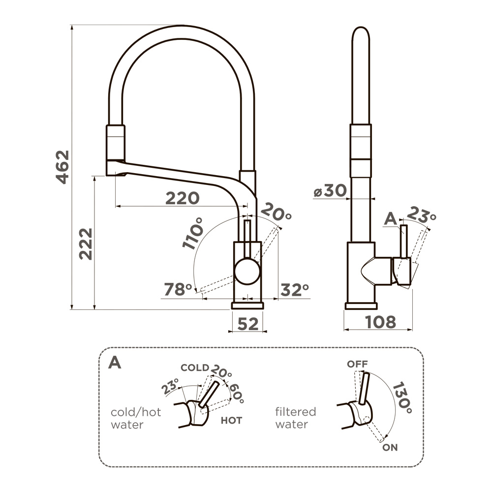 Смеситель для кухни Omoikiri Sinto 2 Plus с подключением фильтра оснащен рычажным управлением для регулировки температуры и напора воды. Горизонтальный монтаж на 1 отверстие. Гибкий излив 220 мм.