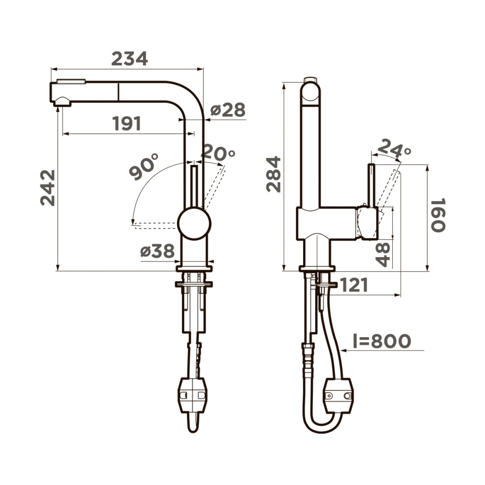 Смеситель для кухни Omoikiri Tanigawa оснащен рычажным управлением для регулировки температуры и напора воды. Горизонтальный монтаж на 1 отверстие. Вытяжной излив 191 мм.