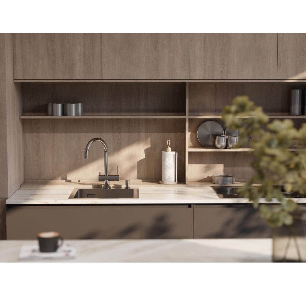 Смеситель для кухни Omoikiri Yamada с подключением фильтра оснащен рычажным управлением для регулировки температуры и напора воды. Горизонтальный монтаж на 1 отверстие. Поворотный излив 204 мм.